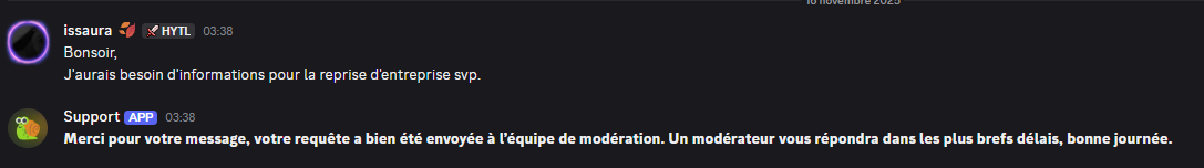 Pour être mis en relation avec le Staff, il suffit d'envoyer un message comme ci-dessous :